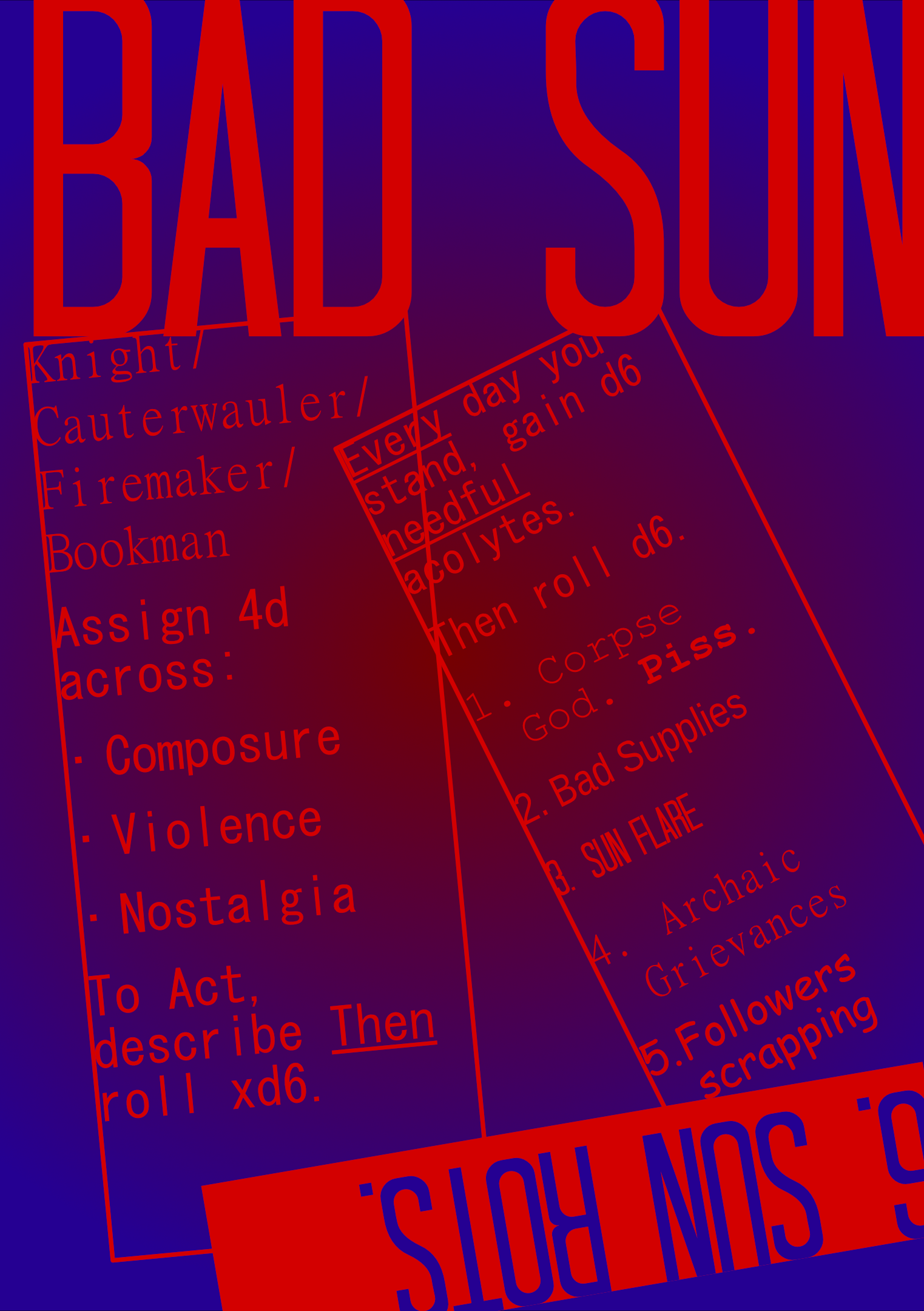 Thank you, that's the intent! It's very tricky to evoke Horrible Post Apocalypse in very few words. I have had a larger BAD SUN game in the pipeline for a few years now so I thought this was a good excuse.
